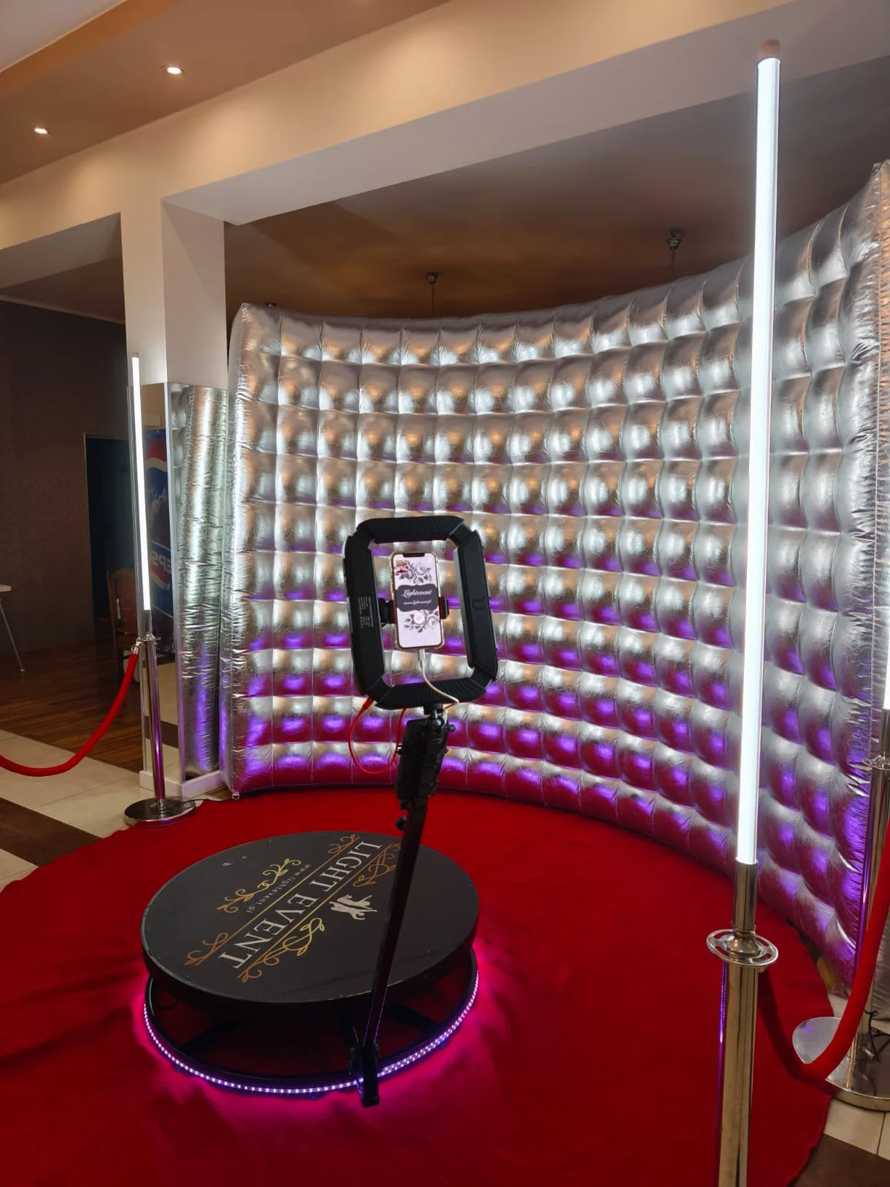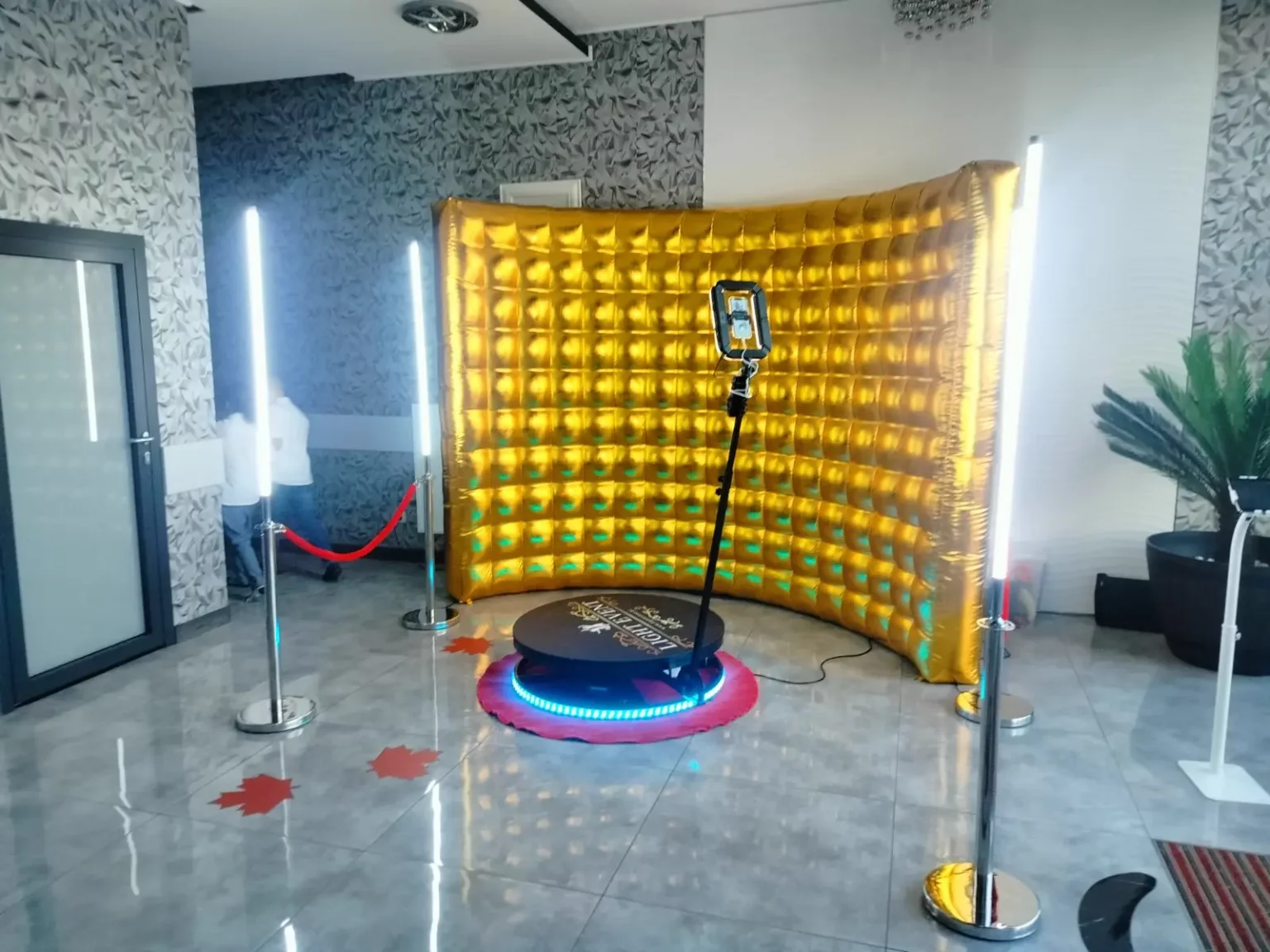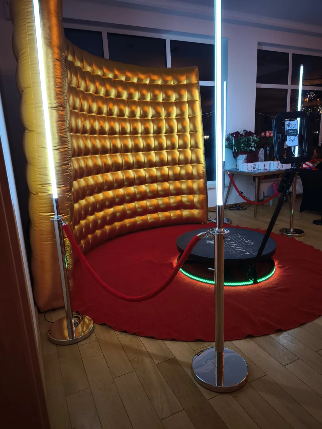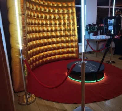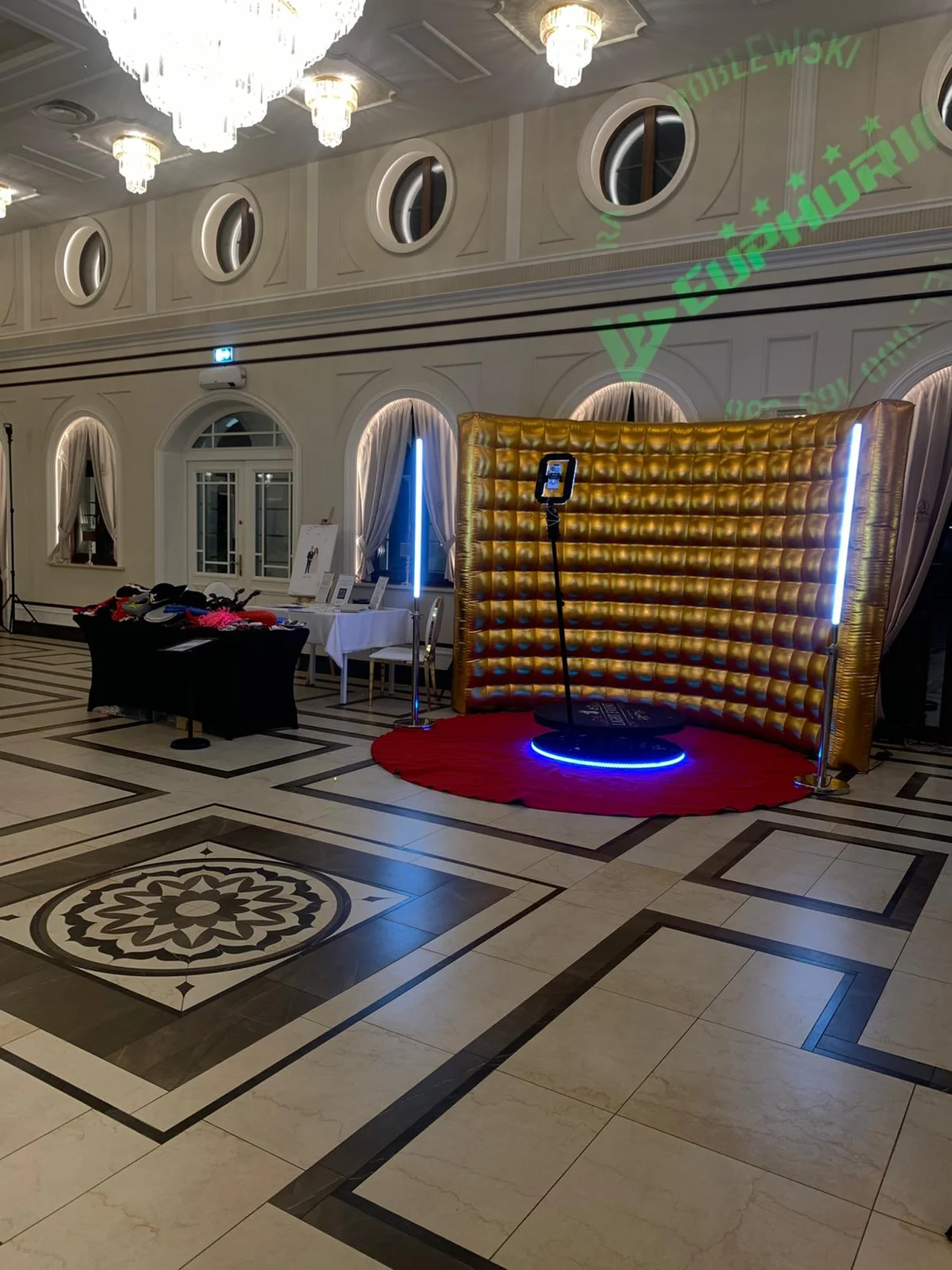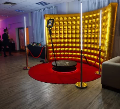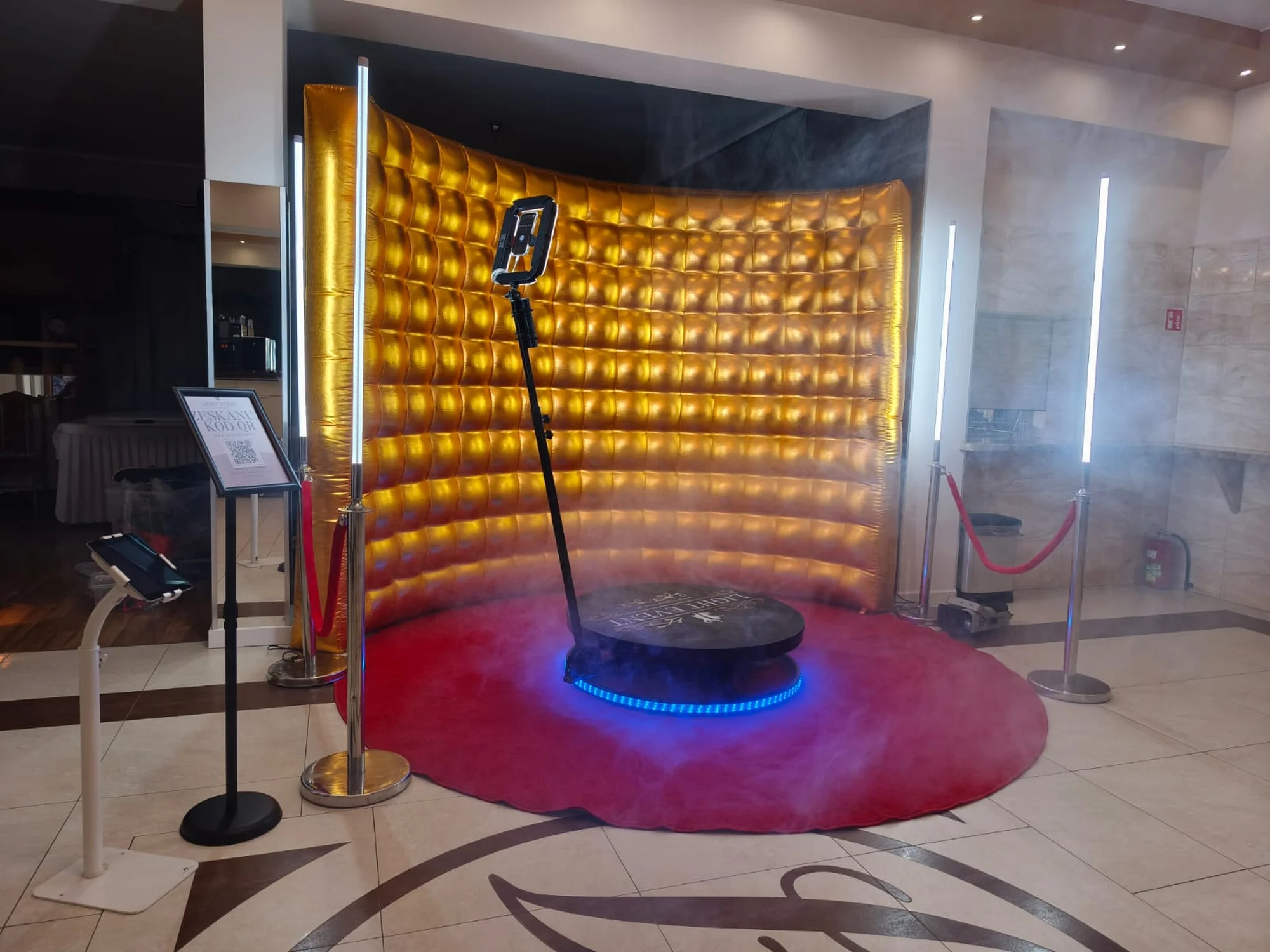W naszej ofercie znajdziesz eleganckie, dmuchane tła w trzech wariantach kolorystycznych: srebrnym, złotym i różowym. Do tego czarny lub czerwony dywan, który podkreśli wyjątkowy charakter Twojego wydarzenia. Dzięki temu każda sesja z fotobudką 360 zyskuje prestiżowy klimat – jak na prawdziwej gali!