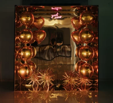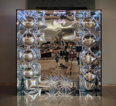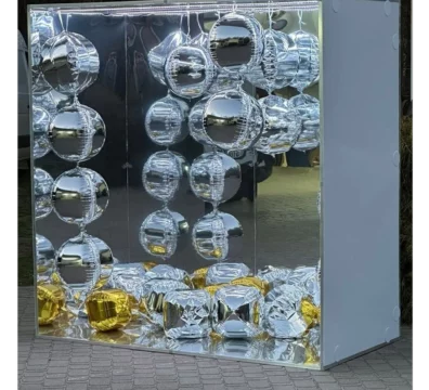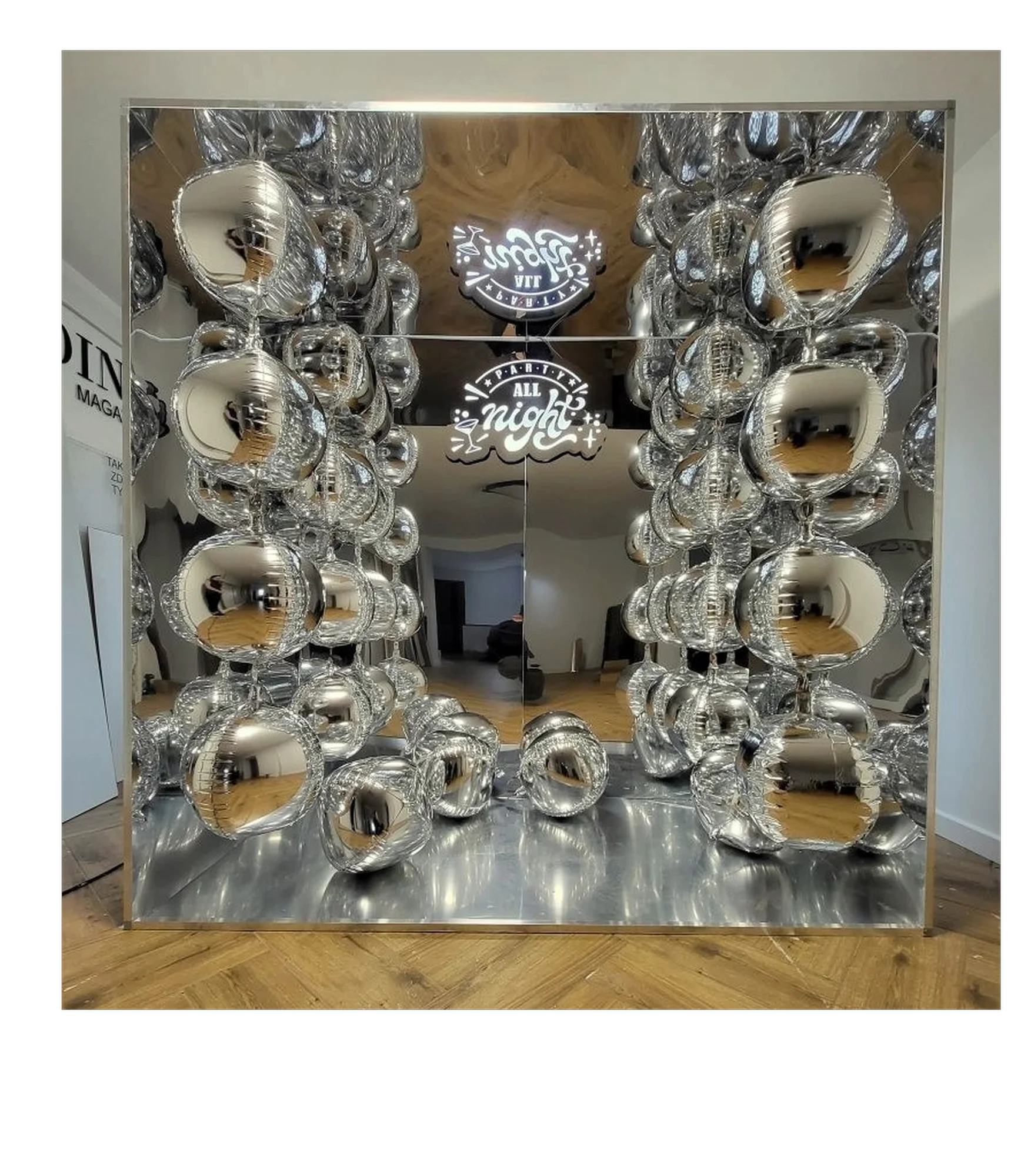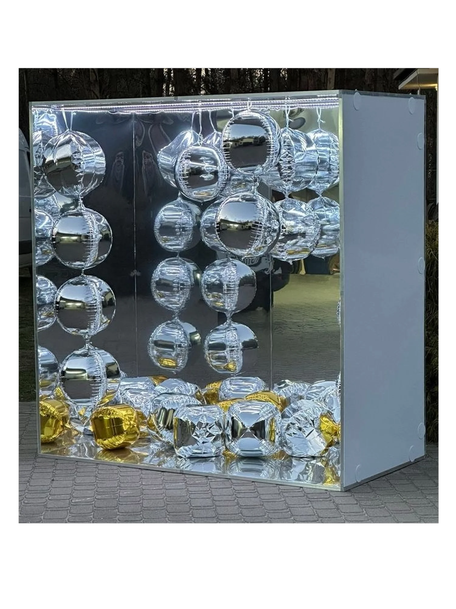 MirrorBox to nowoczesna atrakcja eventowa, która łączy w sobie elegancję, interaktywność i wyjątkowy design. To przestronny box z lustrzanymi ścianami, które tworzą efekt głębi i odbijają światło w sposób przyciągający wzrok. Dzięki subtelnemu oświetleniu i dekoracyjnym elementom, takim jak wiszące balony, Mirror Box staje się idealnym miejscem do tworzenia niezapomnianych wspomnień podczas wesel, eventów firmowych czy innych uroczystości.