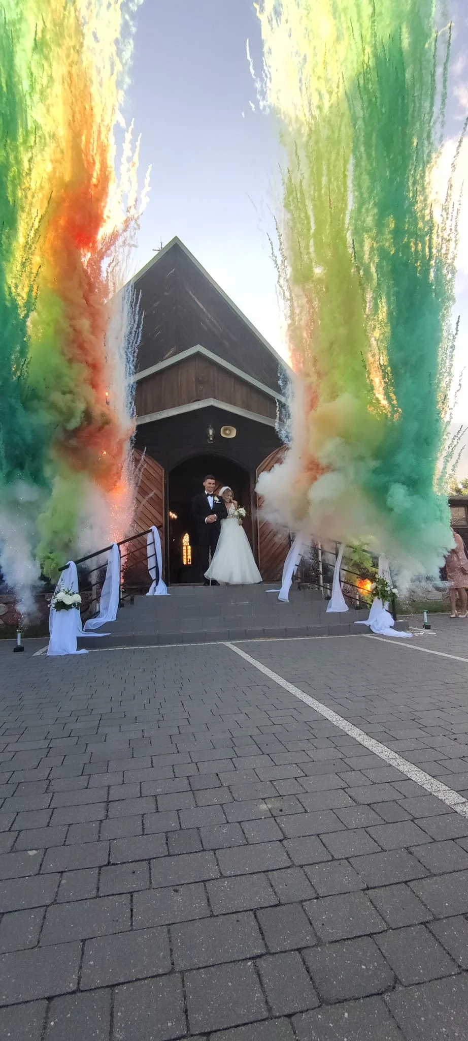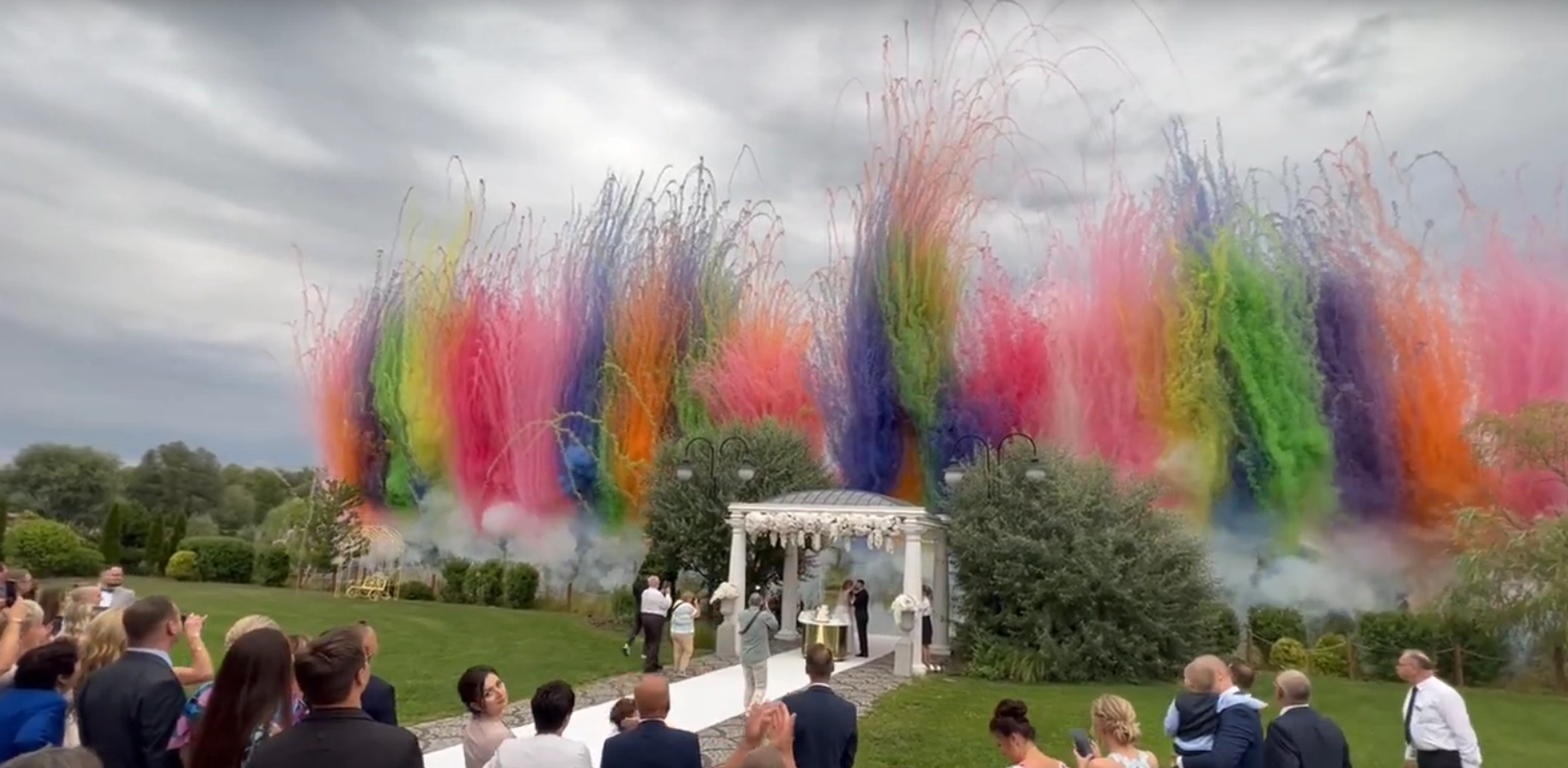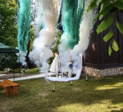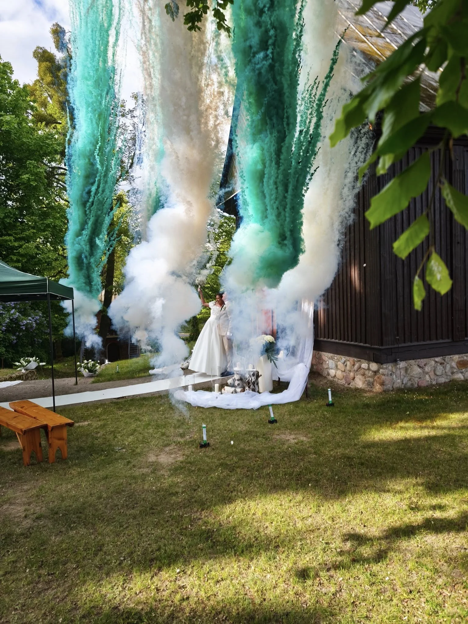 Wystrzałowy dym to intensywny kolorowy wystrzał, który doda energii i koloru Twojemu wydarzeniu. Idealny na wejście pary młodej, wjazd tortu czy zakończenie ślubu plenerowego.